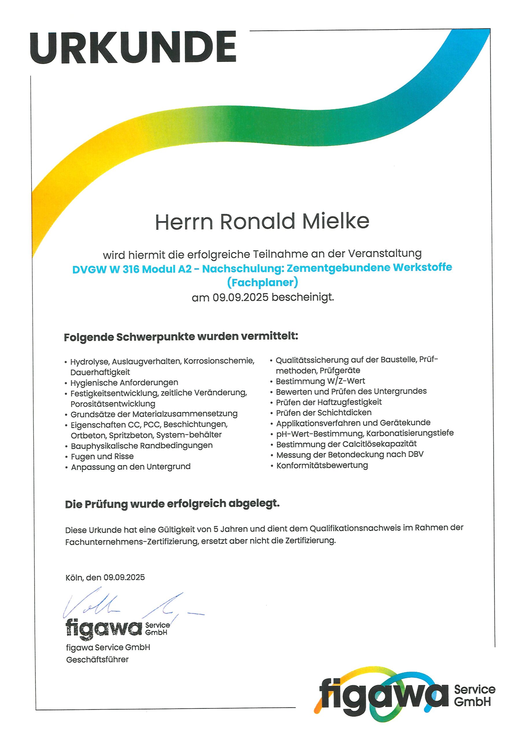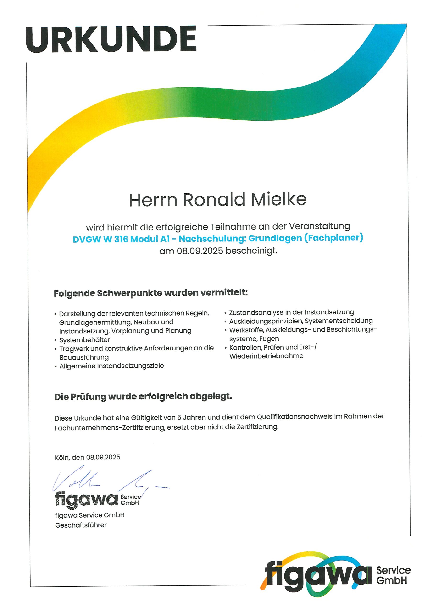 Als Fachplaner DVGW W 316 liegt unser Schwerpunkt im Neubau und in der Instandsetzung von Trinkwasserbehältern sowie allen behälterähnlichen Objekten, bei denen trinkwasserhygienische Anforderungen an Stoffen, Stoffsystemen und Ausführungsverfahren gestellt werden.